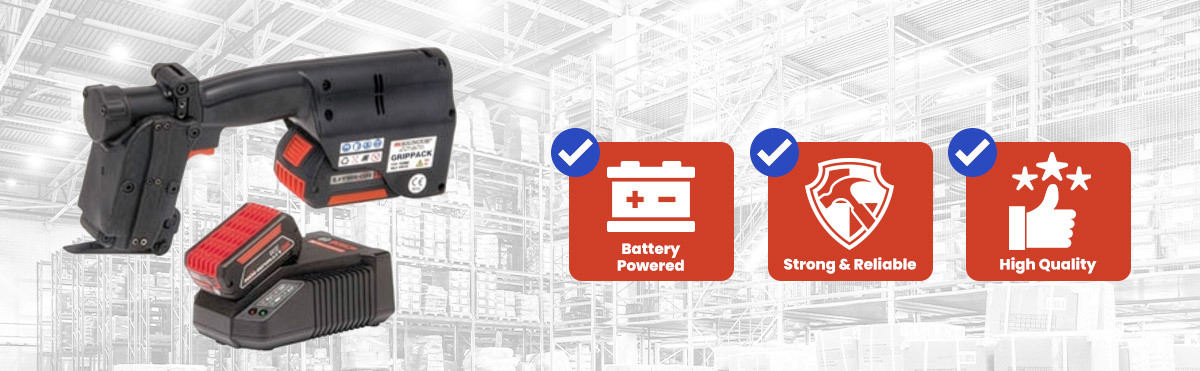 Battery operated steel strapping cutters are designed to improve safety and efficiency when removing steel banding in industrial environments. These cordless tools eliminate the need for manual cutting force while providing controlled cutting performance on tensioned strap. Complete Packaging Products offers the Signode GripPack cutter, a one-hand operated tool built for consistent cutting across high-volume applications. Ideal for warehouses, manufacturing facilities, and receiving operations, these cutters help reduce operator fatigue while improving workflow and safety during strap removal.