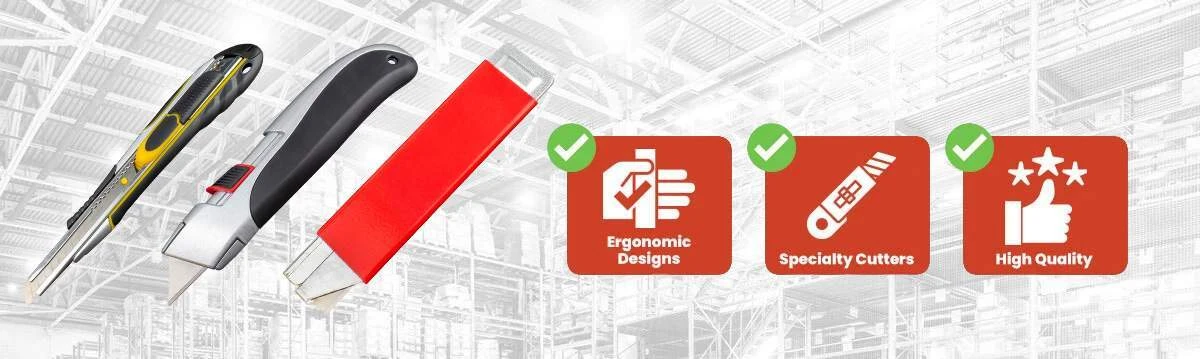 Discover a reliable selection of retractable knives, tap knives, and rotary safety cutters engineered for performance and user safety. Whether you need adjustable blade control, fast tape cutting, or effortless slicing through stretch wrap and packaging, these tools are built to improve efficiency while reducing the risk of injury in demanding work environments.